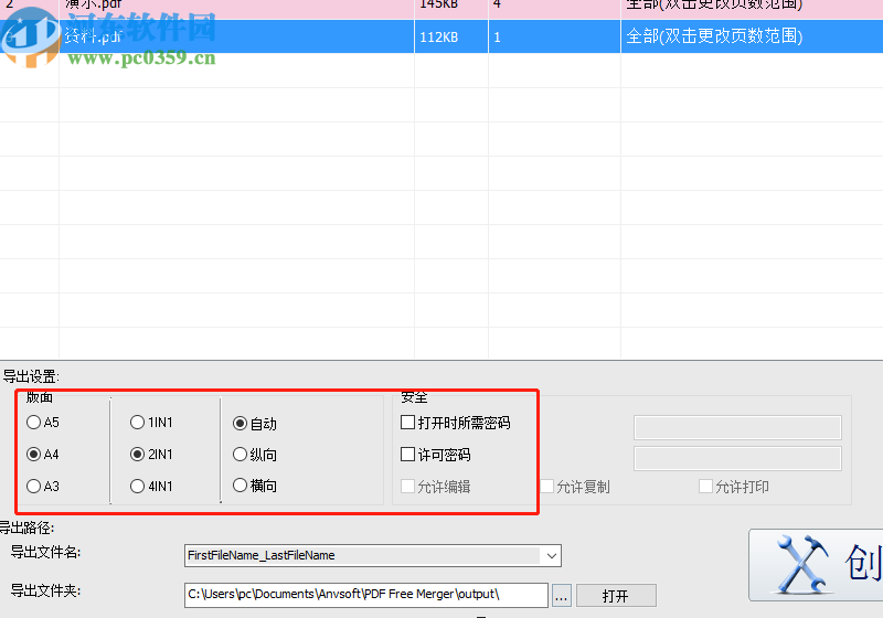 4.点击选择好合并页面之后,下一步在导出设置模块中还可以设置导出的版面和一些安全设置选项。