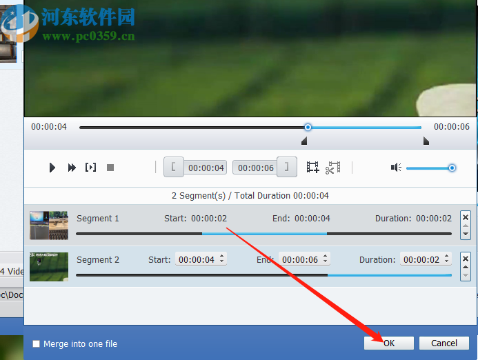 5.点击剪切图标将选择的片段剪切下来之后,我们在界面中就可以看到剪切的视频片段了,然后我们点击右下角的OK按钮。