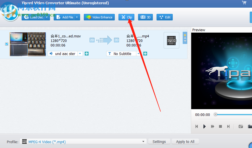 3.点击打开按钮之后就可以成功的将视频添加进来了,然后下一步我们需要选中视频点击上方的Clip这个功能按钮。