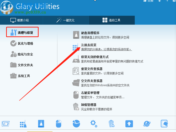2.紧接着在高级工具的清理与修复这个模块中就可以看到注册表修复这个功能了,然后我们需要点击进去。