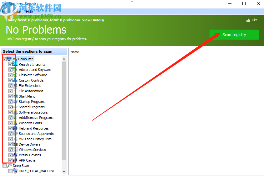 3.点击进入到注册表清理功能界面之后,在界面左边勾选自己想要扫描清理注册表的一些选项,勾选之后点击右上角的按钮开始扫描。