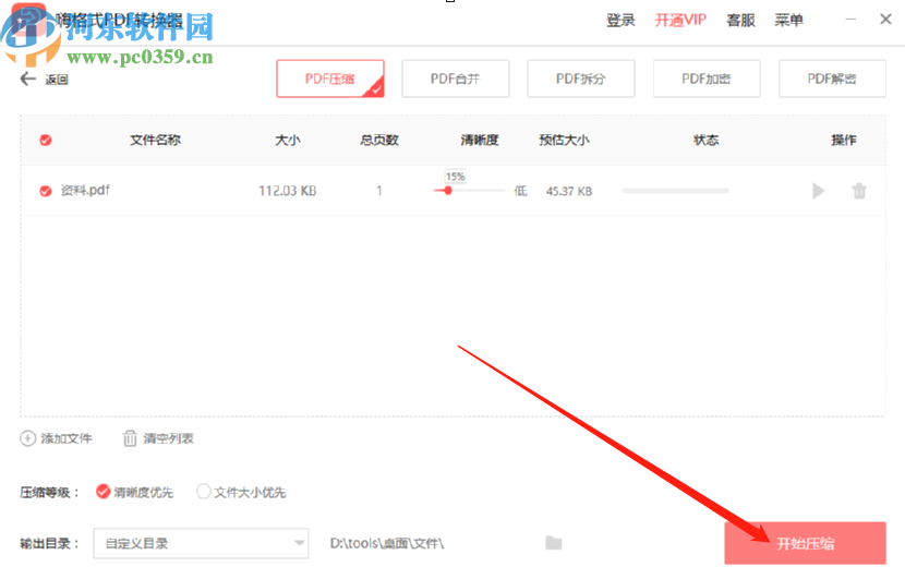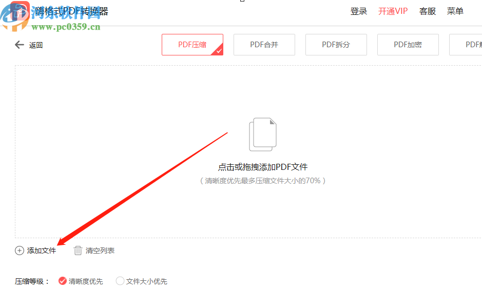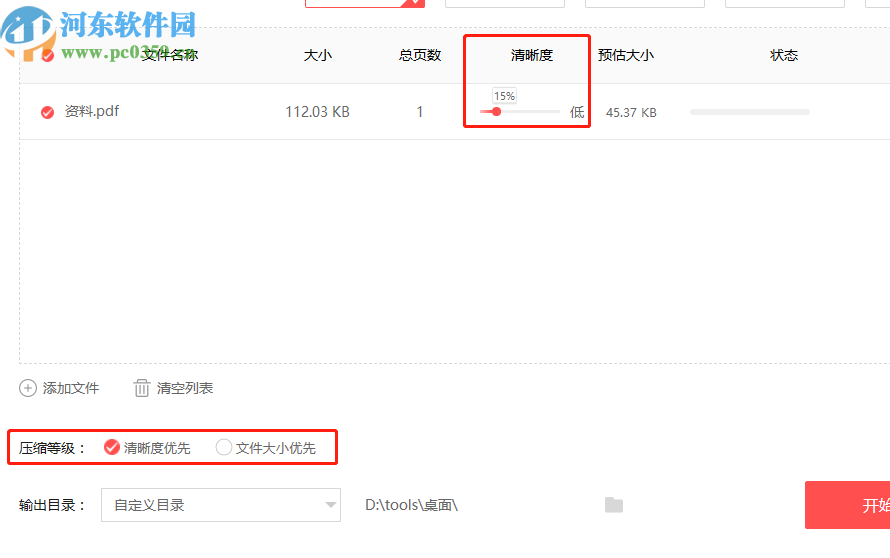 4.将需要压缩的PDF文件添加进来之后,下一步就是设置压缩的等级了,同时还可以根据用户的需求调整清晰度。