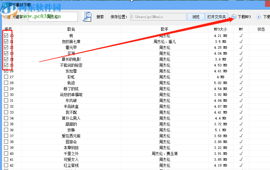 5.最后一步我们只需要在列表中勾选想要下载的歌曲,然后点击界面右边的下载MP3这个功能按钮就可以开始下载歌曲文件了。