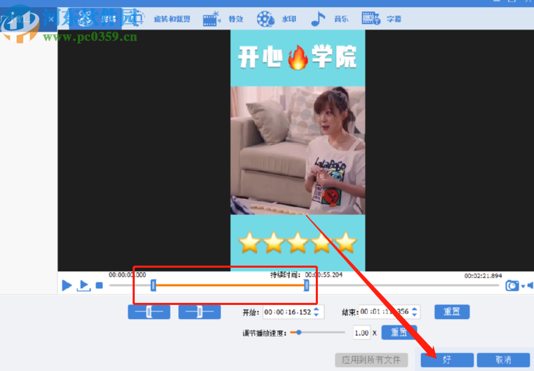5.进入到剪切视频文件的界面之后,我们移动选取剪切片段的两个点,选择好想要剪切的位置之后点击右下角的“好”按钮。