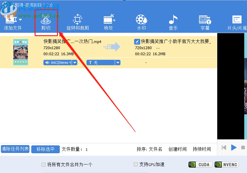 4.点击打开按钮之后我们在界面中就可以看到添加进来的视频文件了,然后我们点击上方的剪切功能按钮。