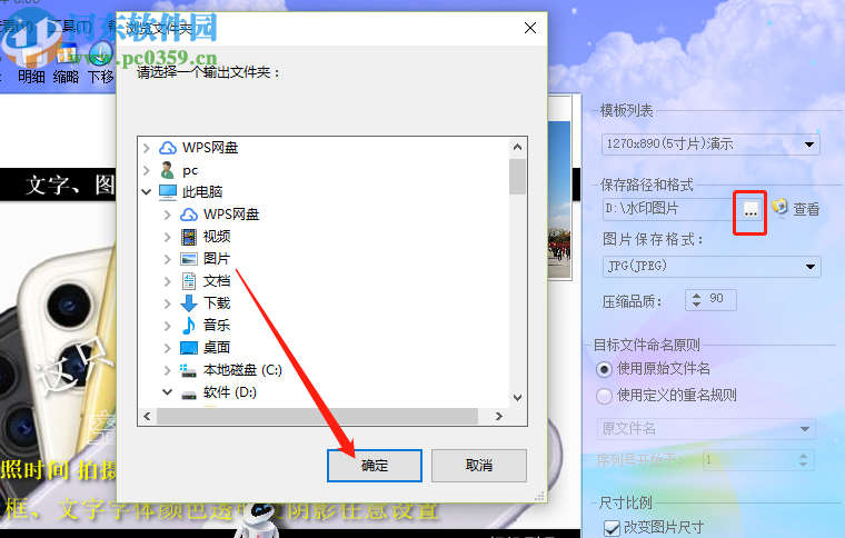 4.选择水印模板设置好水印演示之后,我们点击保存路径选项下面的三点按钮即可选择文件的输出路径,然后我们在出现的界面中点击确定按钮即可。