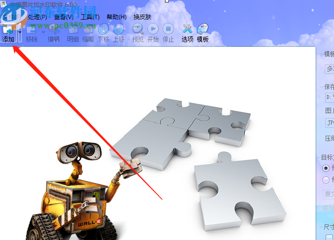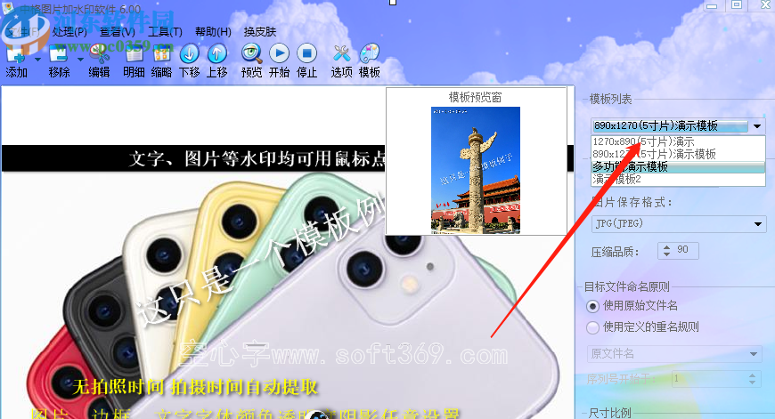 3.点击确定按钮将图片添加到软件界面之后,在界面右边找到模板列表,打开下拉选项之后即可选择想要使用的水印模板。