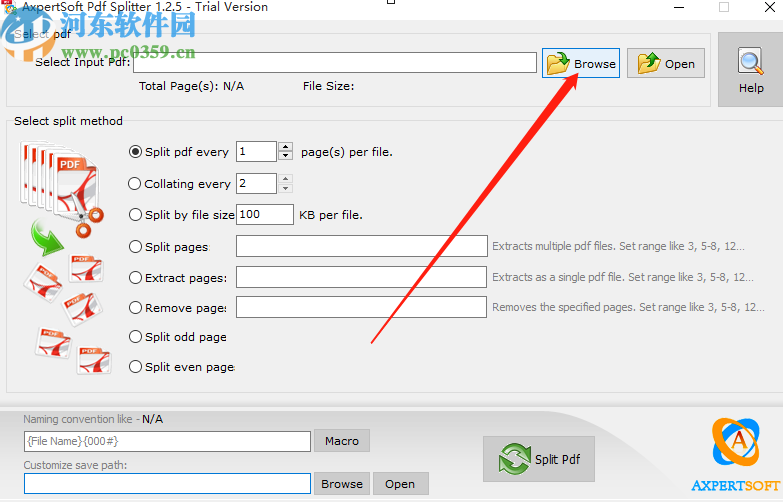 1.首先第一步我们点击界面中的Browse这个功能按钮即可选择想要分割的PDF文件,如下图中所示。