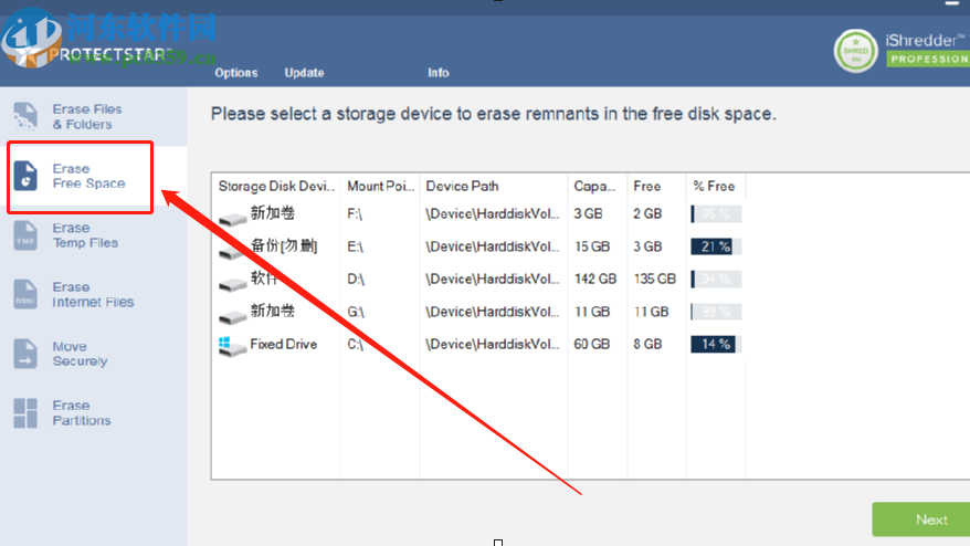 1.首先第一步我们打开软件之后在界面的左边切换到Erase Free Space这个空间清理功能界面中。