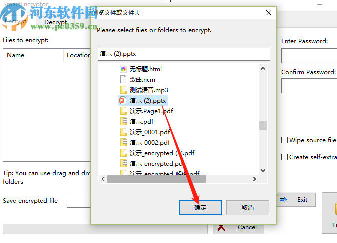 2.点击添加文件按钮之后,紧接着在出现的选择文件界面中,我们选中想要加密的文件之后点击下方的确定按钮。