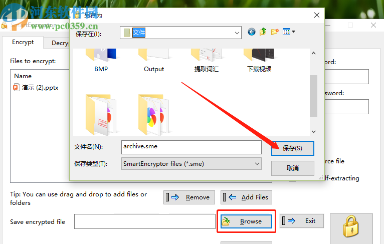 4.输入密码之后我们点击保存加密文件选项后面的Browse浏览按钮,点击之后在出现的界面中可以选择文件加密之后的输出储存位置。