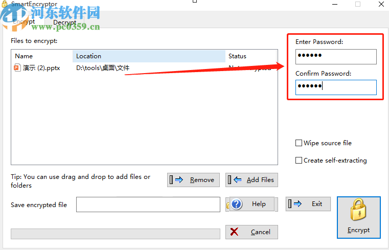 3.点击确定按钮将文件成功添加进来之后,下一步就是设置加密文件的密码了,在界面右边输入密码和确认密码中输入我们想要加密文件的密码。