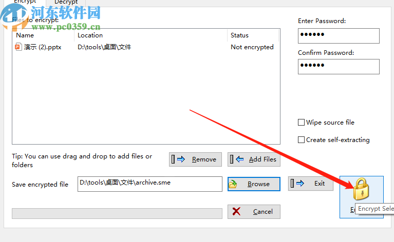 5.设置好文件加密之后的输出储存位置之后,我们点击界面右下角的Encrypt这个加密功能按钮即可加密文件。