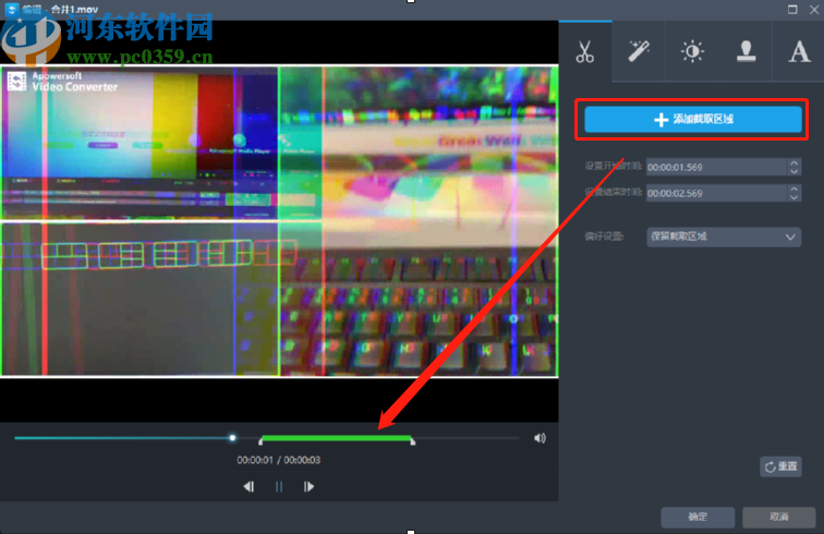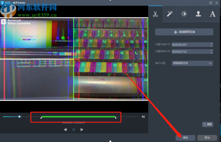 5.点击添加截取区域之后我们就可以在视频的进度条中调整想要剪切的视频片段位置了,选择好要剪切的位置之后我们点击下方的确定按钮即可。