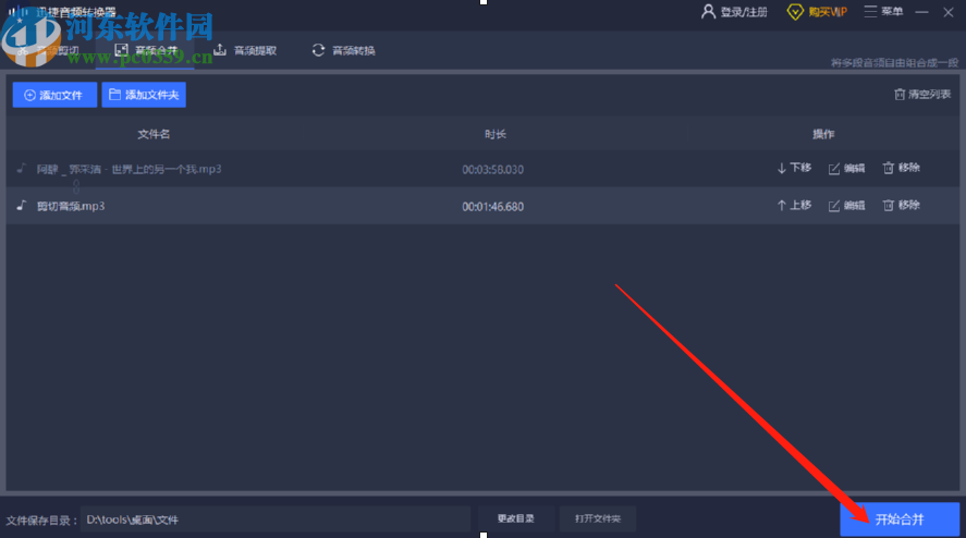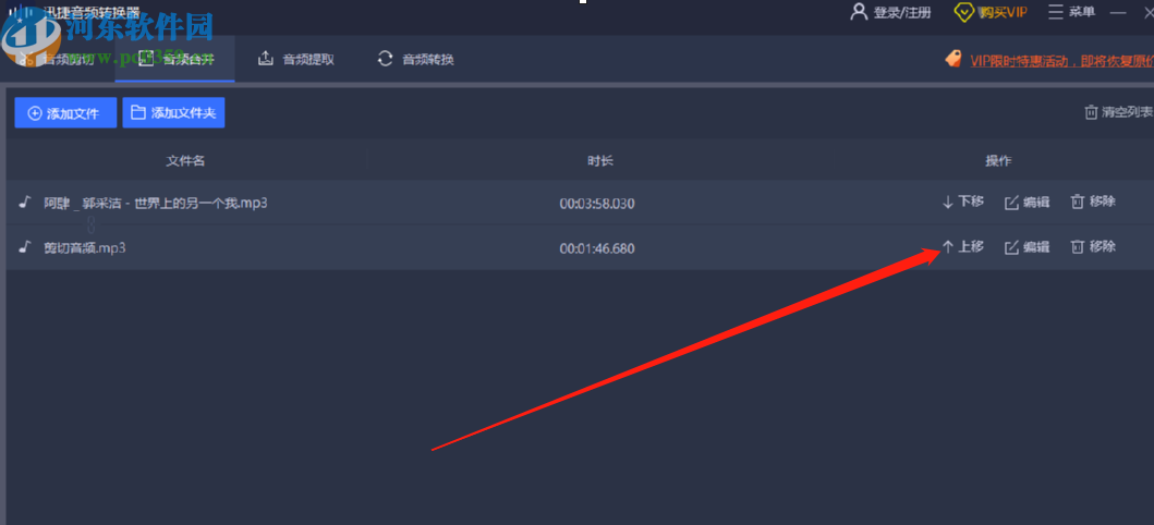 3.点击这个打开按钮之后我们就可以在界面中看到添加进来的音频文件了,然后我们点击上移或下移可以调整它们合并的顺序。