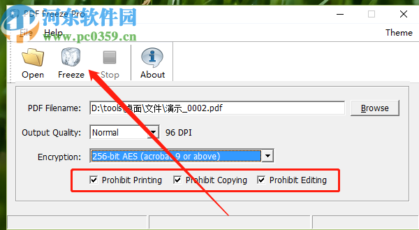 5.选择好加密算法之后我们需要勾选加密的权限,有禁止改写、禁止复制、禁止编辑这个三个选项,全部勾选之后点击上方的Freeze这个按钮即可开始加密。