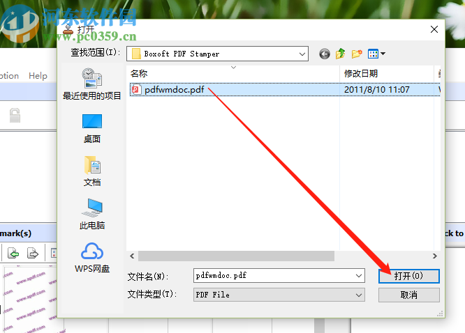 2.点击加号之后会打开一个选择文件的界面,然后我们在这个界面中选中想要添加水印的PDF文件,选中之后点击打开按钮。