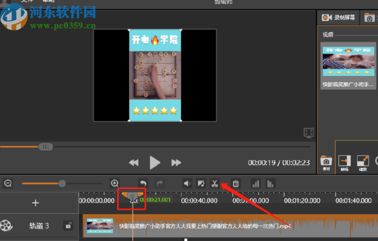 5.拖放到操作台之后我们在界面中移动选取视频的指针,移动到想要剪切的位置之后点击工具栏中的剪刀图标。