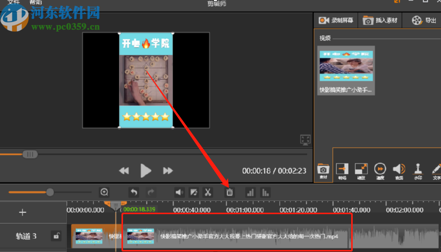 6.点击选择好想要剪切的位置之后,我们将分割出来的多余片段给删除掉,点击选择要删除的片段然后点击垃圾桶图标即可。