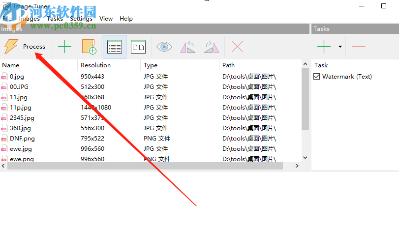 6.最后我们设置好水印之后在界面右边就可以看到添加的这个设置水印的任务了,点击界面左边的Process这个按钮即可开始批量给图片添加水印。