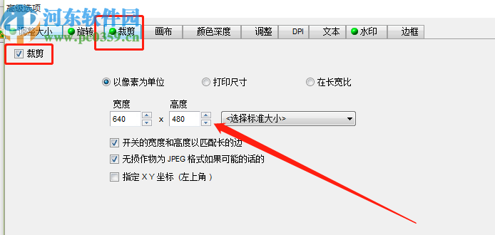 4.点击高级选项之后就打开了高级选择界面,在其中我们切换到裁剪这个功能,然后勾选裁剪功能选项,如下图中所示。