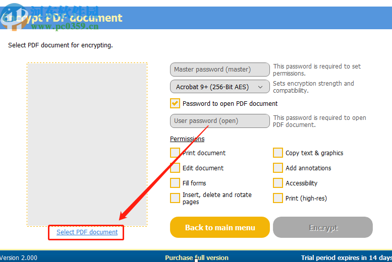 2.进入到PDF加密这个功能界面之后我们点击界面中的Select PDF document这个选项,点击之后即可选择想要加密的PDF文件。