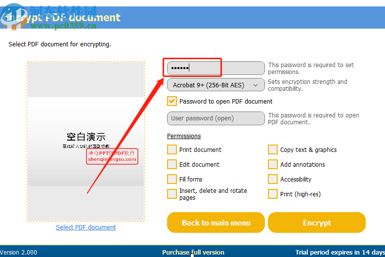 5.在下方还有一个输入密码的输入框,这个密码是对PDF文件权限进行设置的密码,我们设置这个密码之后可以对PDF文件的复制、编辑、打印等权限进行设置。