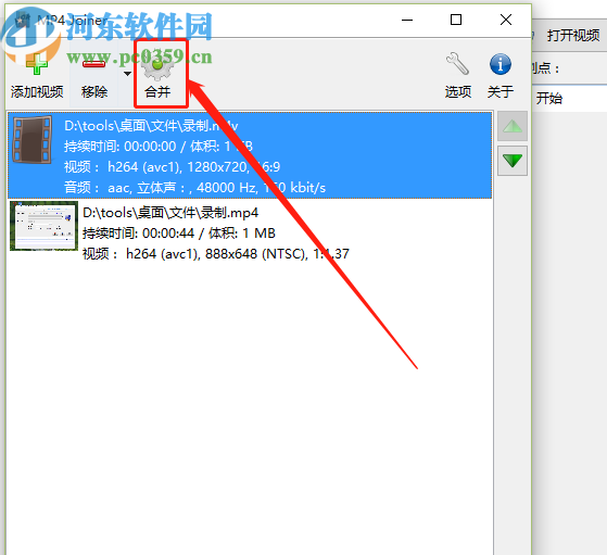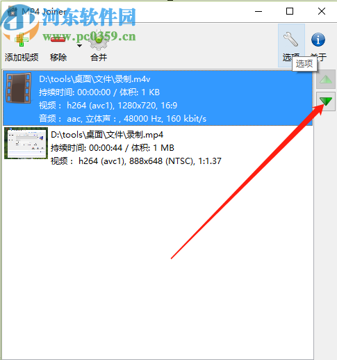 3.点击打开按钮之后我们在界面中就可以看到选择添加进来的视频文件了,然后我们点击选中视频然后点击右边的上下三角图标可以调整它们的合并顺序。