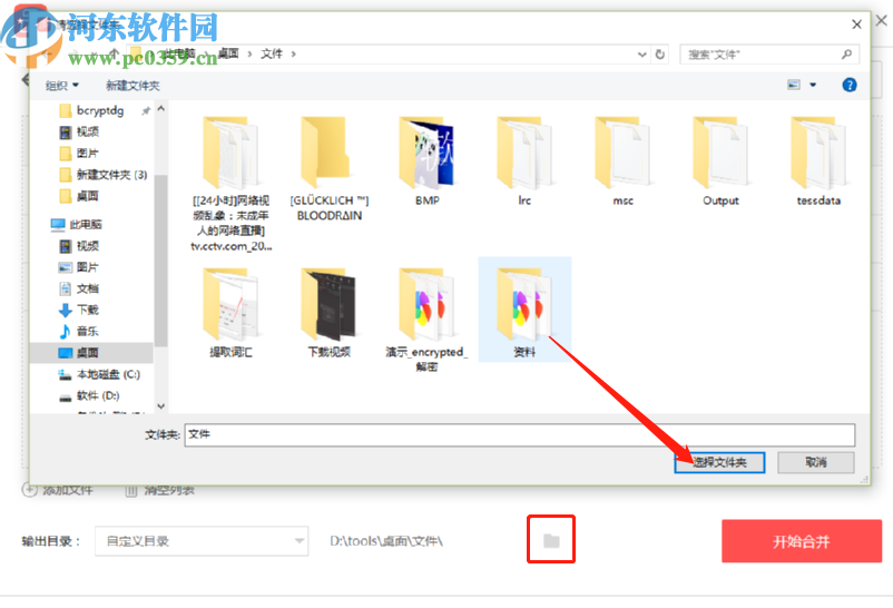 5.调整好合并顺序之后我们在输出目录选项右边点击文件夹图标,点击之后可以选择文件合并之后的输出保存位置,大家根据自己的需求设置即可。