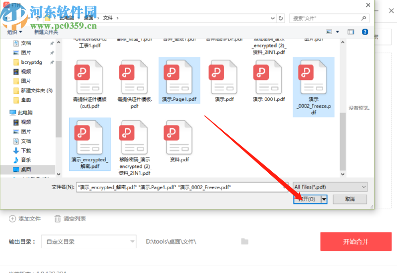 3.点击添加文件之后紧接着在出现的选择文件界面中我们选中所有想要合并的PDF文件之后点击右下角的打开按钮,按住键盘Ctrl键即可多选。