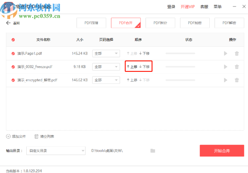 4.选择好想要合并的PDF文件之后在界面中点击上移或者下移按钮可以调整这些文件的合并顺序。