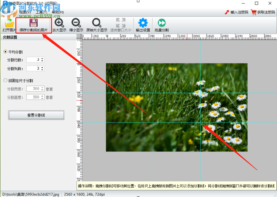 5.点击重置分割线按钮之后就可以在界面中的分割辅助线看到我们设置的分割参数分割图片之后的效果了,满意的话点击界面左上方的保存分割后的图片按钮。