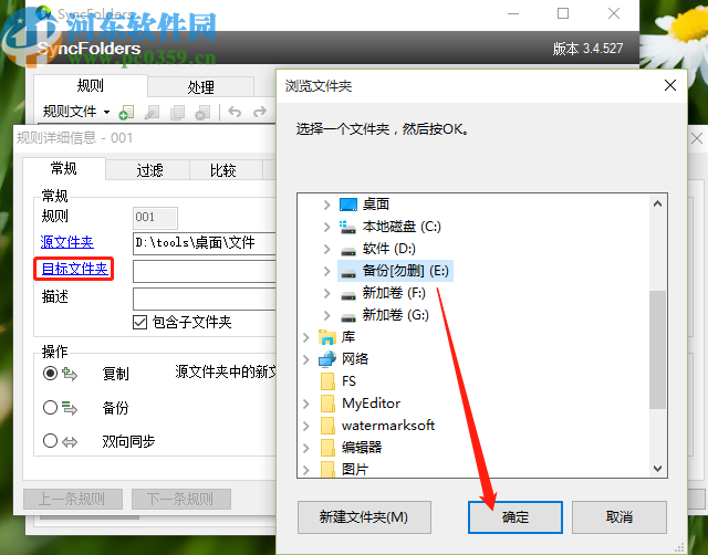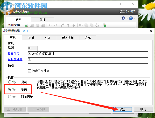 4.当我们选择好备份任务的源文件夹和目标文件夹之后,在下方的操作模块中选中备份这个功能,选中之后点击右下角的确定按钮即可。