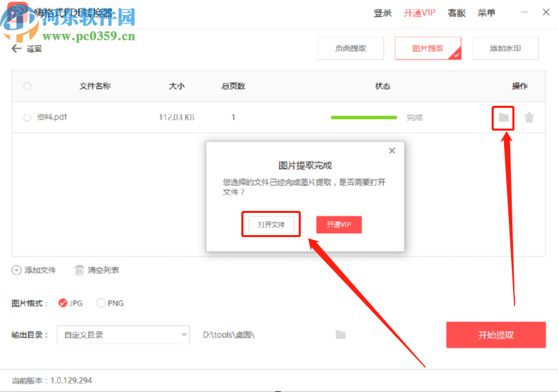 7.等到提取完成之后界面中会出现一个提取完成的提示,我们点击打开文件按钮或者操作模块下面的文件夹图标即可查看提取的图片。