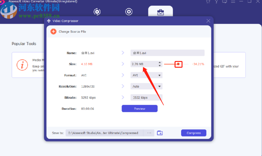 5.点击打开按钮之后就会进入到压缩视频的参数设置界面了,我们移动压缩率进度条上的小圆点可以调整压缩视频的大小,左右移动调整的过程中可以看到大小变化。