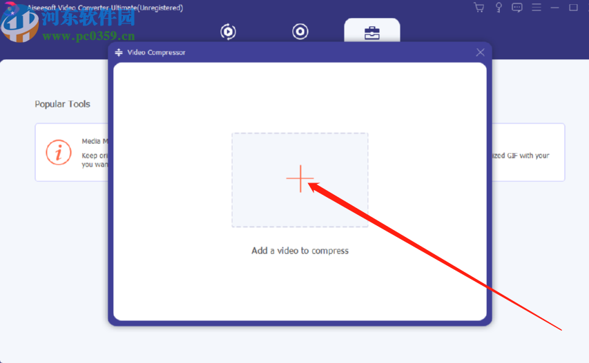 3.点击视频压缩功能之后会出现下图所示的界面,然后我们需要点击界面中的加号图标,点击之后即可选择添加想要压缩的视频文件。