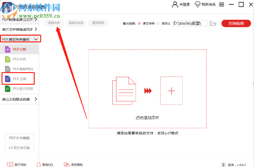 1.首先第一步我们打开软件之后在界面左边点击打开PDF其他相关操作这个选项,打开之后在出现的选项中点击选择PDF压缩这个功能,然后点击添加文件按钮。