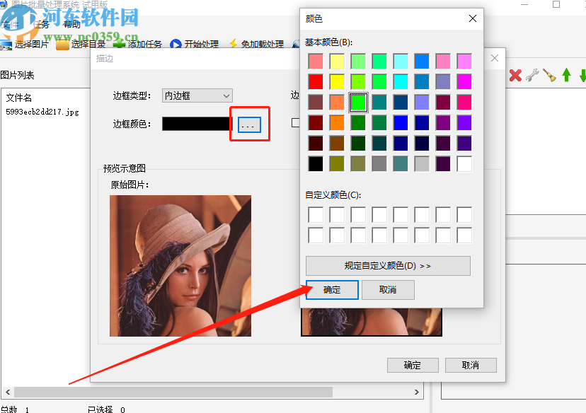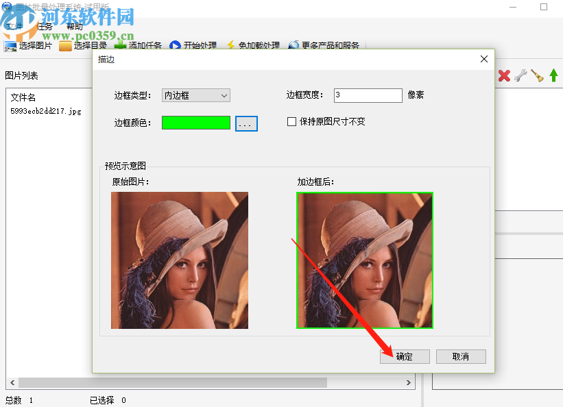 7.选择好颜色之后我们在加边框后这个图片预览界面中可以看到图片添加边框之后的效果,满意之后点击确定按钮即可。