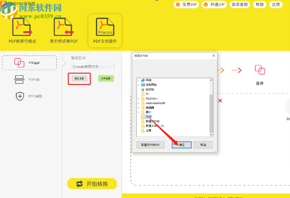 3.点击打开按钮之后下一步我们需要点击界面中的更改目录按钮,然后在出现的界面中选择想要保存合并文件的目录。