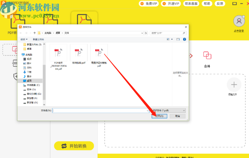 2.点击添加文件按钮之后就会打开一个选择文件的界面了,在这个界面中我们选中想要合并的PDF文件之后,点击右下角的打开按钮。