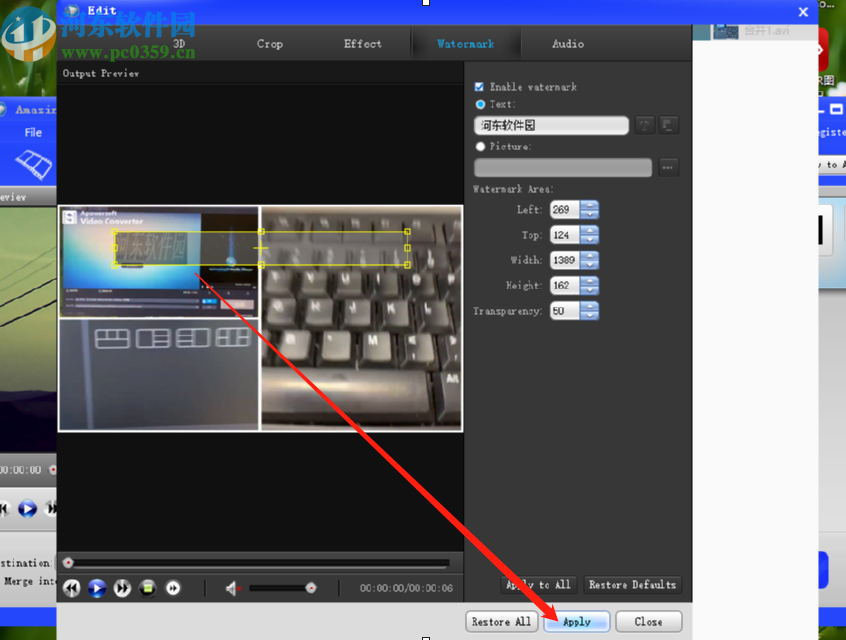 7.用户根据自己的需求设置好文字水印的样式之后,在视频中可以预览到水印的效果,满意的话点击右下角的Apply应用按钮即可保存添加水印的相关设置。