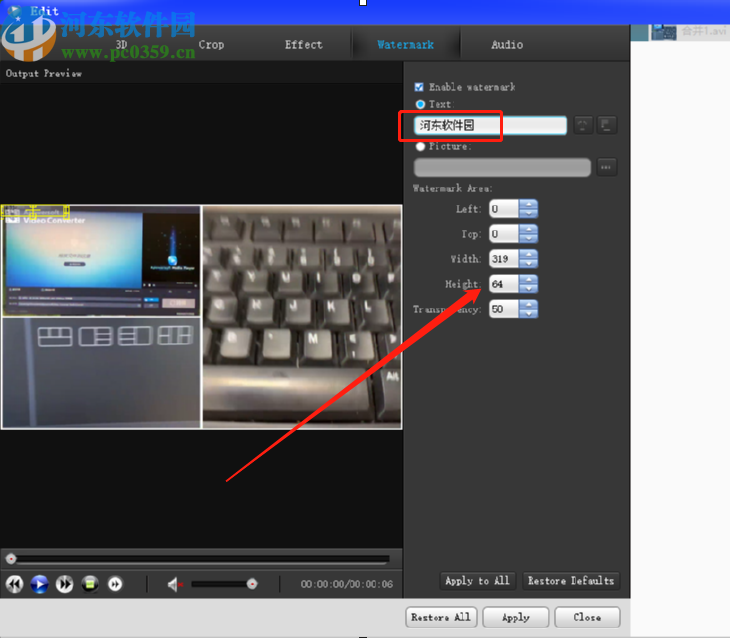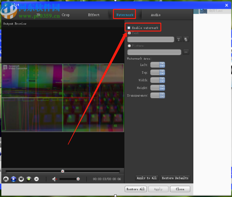 4.点击这个编辑功能之后在出现的编辑视频界面中选中Watermark这个水印选项,然后勾选界面中的Enable waterark选项。