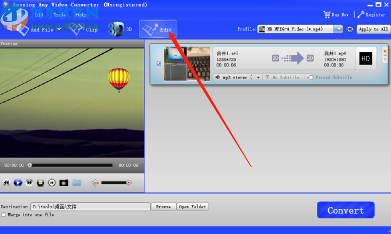3.点击打开按钮之后我们在软件界面就可以看到添加进来的视频了,然后我们点击界面上方的Edit这个编辑功能。