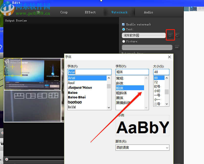 6.设置好水印宽高参数之后,我们点击水印内容右边的T字按钮,然后就可以打开设置水印文字字体、字形和大小的界面了,用户根据自己的需求设置即可。