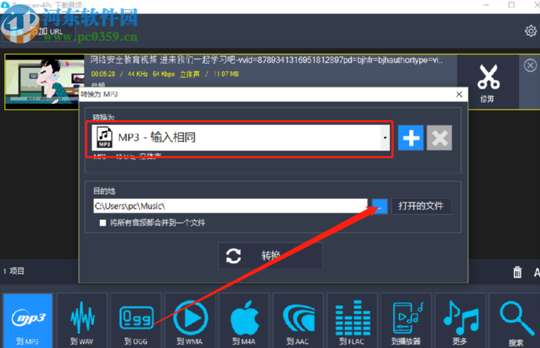 5.点击转换到MP3这个功能按钮之后会出现下图所示的界面,在这个界面中我们可以选择转换的音频格式质量,然后点击三点按钮可以设置输出文件夹。