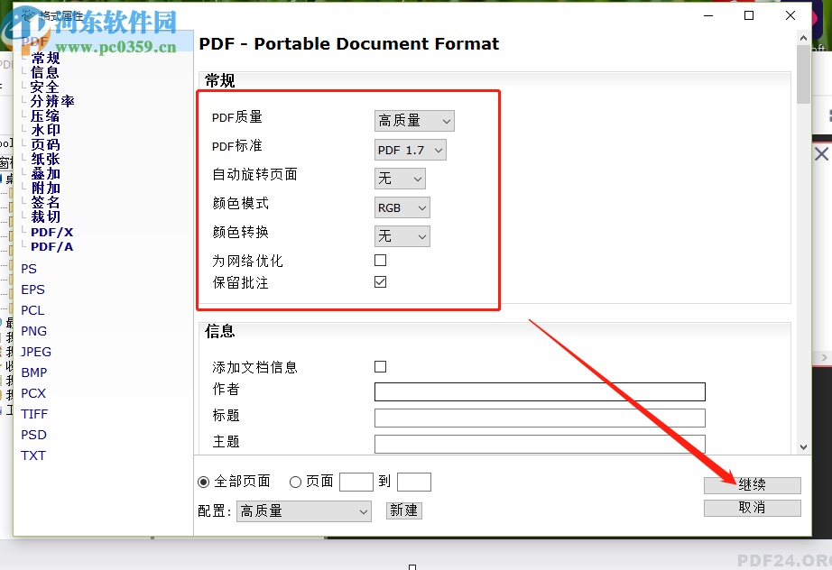 6.点击另存为选项之后,我们会来到下图所示的界面,可以根据自己的需求来调整PDF文件的这些常规参数和信息内容,填写完成之后点击继续按钮。