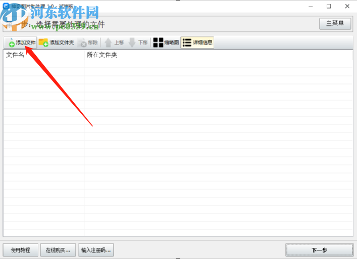 1.首先第一步我们点击打开软件之后在软件界面的左上角点击添加文件按钮,点击这个添加文件按钮之后即可选择想要批量处理的图片。