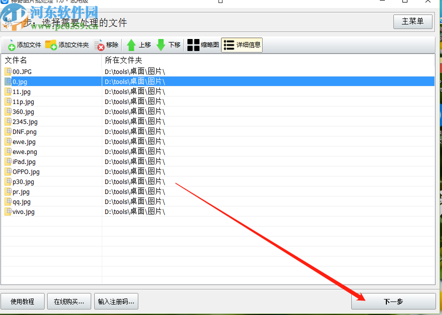 3.点击这个打开按钮之后我们在软件界面就可以看到添加进来的图片列表了,然后我们点击右下角的下一步按钮。