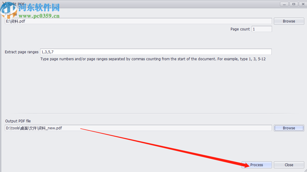 6.最后设置好分割文件的输出位置之后我们点击界面右下角的Process这个按钮即可开始分割PDF文件的操作。
