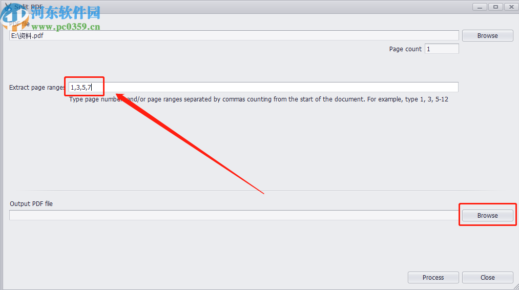 4.点击打开按钮之后就成功选择好需要分割的PDF文件了,选择之后在界面中可以设置分割PDF文件的页码,也就是要将哪些页面进行分割,用户根据自己的需求来输入之后点击下方输出文件夹的Browse按钮。